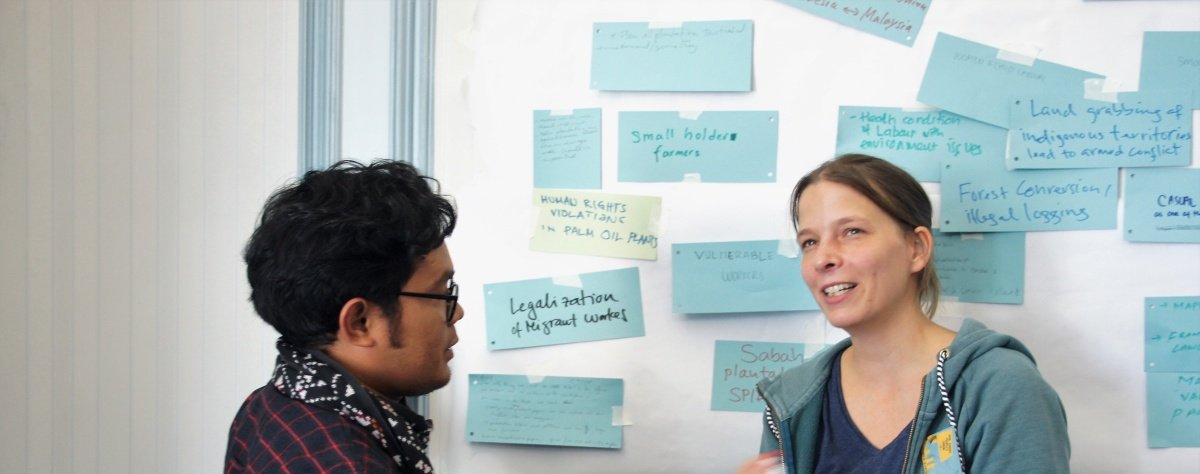 Anschließend wurden Herausforderungen bei der Vernetzungsarbeit identifiziert, wie z.B. die intransparenten Strukturen von Konzernen. Häufig ist unklar aus welchen Plantagen oder von welchen kleinbäuerlichen Betrieben Palmfrüchte von welchen Konzernen angekauft werden. Stark diskutiert wurde die Frage mit welchen Mitteln man Gewerkschaften über Grenzen hinweg vernetzen kann. Das vielfältige Wissen der Teilnehmenden aus verschiedenen Ländern brachte wichtige Informationen und Anknüpfungspunkte zu weiteren Vorgehen hervor.