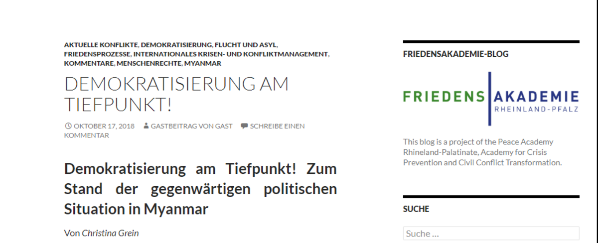 Die Menschenrechtssituation hat sich dramatisch zugespitzt. Die Regierung der Friedensnobelpreis-Trägerin Aung San Suu Kyi scheint gescheitert. Ein Beitrag der Burma-Initiative für den Blog der Friedensakademie Rheinland-Pfalz.