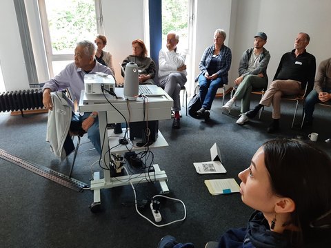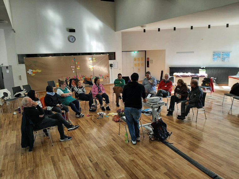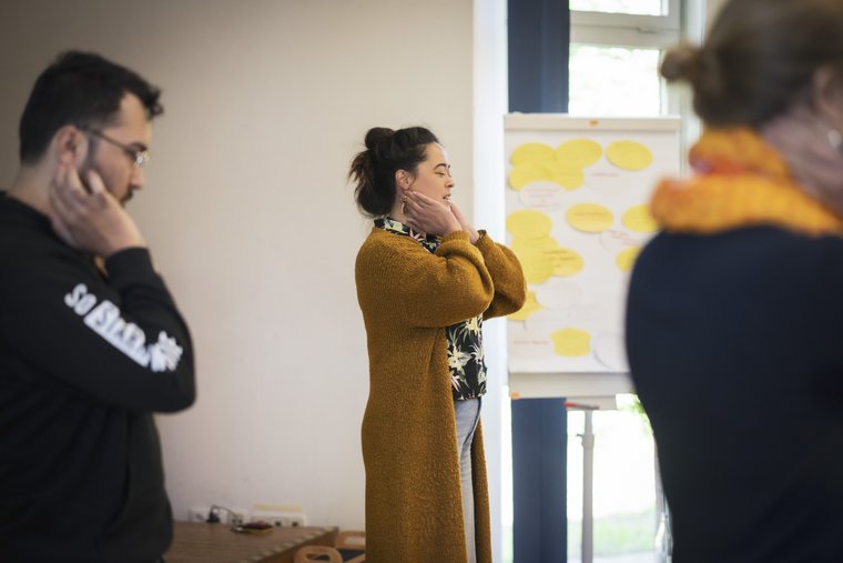 Am zweiten Seminartag kam so einiges in Bewegung - nicht nur an Input und Ideen, sondern auch körperlich. Gemeinsam klopften die Anwesenden vor der Sitzung ihre Körper ab, um ihre Konzentration zu fördern (Foto: Lilli Breininger).