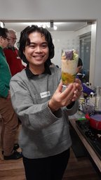 Nach einem langen Seminartag gab es zur 'Belohnung' selbstgemachtes Halo-Halo angeleitet u.a. durch Maite Dittke (Abb.1, v.r.), die den Ube-Creme vor den neugierigen Blicken der Anwesenden frisch zubereitete. Den Teilnehmer:innen hat es geschmeckt! Mit einem Bauch voller Halo-Halo wurde im Anschluss der Dokumentarfilm "Der unberechenbare Faktor" geschaut. In der BeWild-Films Produktion wird das Thema Klimawandel im Kontext von Wissenschaft und Umweltaktivismus aufgearbeitet (Fotos: Lilli Breininger (Abb. 1+2); philippinenbüro).