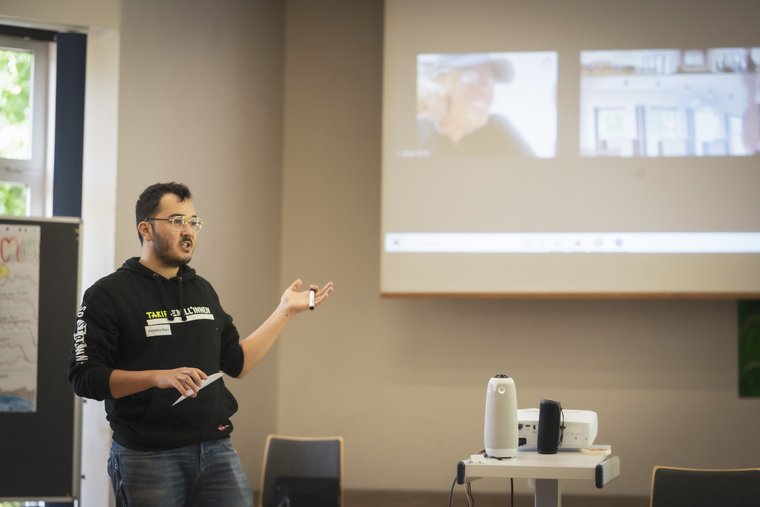 Amadeo Kaus von Friday for Future (FFF) Köln beantwortete nach einem kurzen Film die Fragen der Seminarteilnehmenden zu zivilgesellschaftlichen Allianzen im öffentlichen Transportsektor. In der Kampagne "WirFahrenZusammen" hatte sich FFF in Deutschland mit Gewerkschaften und Beschäftigten im Nahverkehr zusammengeschlossen und gestreikt. Elmer Forro (h.r.) von Bayan Panay war indessen online aus den Philippinen zugeschaltet und klärte über (Un)Just Transitions im Jeepney Sektor in den Philippinen auf (Foto: Lilli Breininger).