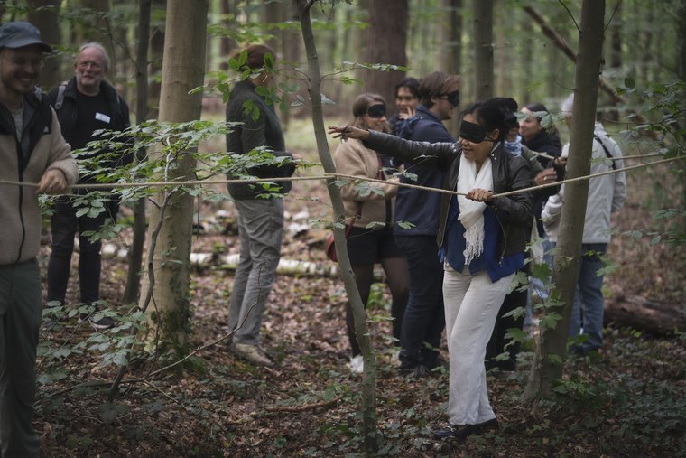 Mit Inge Steinmetz von BioLogo (Abb.1, v.m.) ging es für die Hälfte der Seminarteilnehmenden nach der Mittagspause in den Wald. Mit allen Sinnen wurde hier Wald wahrgenommen und erforscht (Fotos: Lilli Breininger).