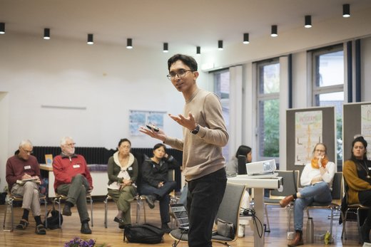 Im Anschluss an das Abendessen begann der philippinische Umweltrechtsaktivist Vennel Chenfoo (Abb.1) mit der inhaltlichen Einführung in das Thema (Un)Just Transitions. In Murmelrunden tauschten sich die Seminarteilnehmenden über die Bedeutung des Begriffs aus und sammelten im Anschluss, ergänzt durch Beispiele von Vennel Chenfoo, ihre Ideen und Beispiele im Plenum (Fotos: Lilli Breininger).