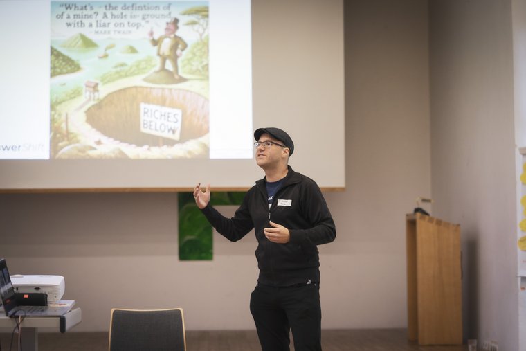 Über den Rohstoffhandel zwischen Deutschland und den Philippinen und der Bedeutung von Metallen für die Energiewende berichtete Michael Reckordt von Powershift. Dabei verdeutlichte er nicht nur bestehende Probleme, sondern stellte auch nachhaltige Lösungen zur Nutzung von Rohstoffen vor. Auch sein Können in der Erstellung von KI-Memes stellte Michael Reckordt eindrücklich unter Beweis (s.Abb.) (Foto: Lilli Breininger).
