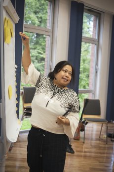 Mit einem ganzheitlichen Ansatz begleiteten die systemische Beraterin Christine-Joahn Meier (l.) und Hannah Wolf (r.) vom philippinenbüro die Teilnehmenden mit "Kopf, Hand und Herz" durch das Seminarwochenende. Visualisiert durch ein großes Boot und inspiriert durch das philippinische Konzept "Bayanihan" (gegenseitige Unterstützung) nahmen die Beiden die Anwesenden mit auf eine Reise. Dabei sollten sich die Teilnehmenden über ihre Interessen, Wünsche an das Wochenende und ihre eigenen Kompetenzen bewusst werden und diese in Figuren und Ruder notieren und in das gemeinsame Boot setzen (Fotos: Lilli Breininger; philippinenbüro; Christine-Joahn Meier).