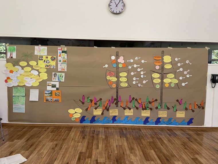 Am letzten Seminartag fassten Christine-Joahn Meier und Hannah Wolf das Seminarwochenende mithilfe des gemeinsam erarbeiteten Bootes zusammen. Es galt Ziele und Wünsche (Insel) für sozial verträglicheren Klimaschutz zu sortieren, den eigenen Herausforderungen zu begegnen und Inspirationen für das eigene Handeln miteinander zu teilen. Auch wenn wir im Rahmen des Seminars unsere Gemeinschaft im Sinne eines Bootes gedacht und bewegt haben, sitzen wir weder im Erleben des Klimawandels noch im Kampf für Klimagerechtigkeit alle in einem Boot. Wir sind mit unterschiedlichen Voraussetzungen, Verantwortlichkeiten und Auswirkungen konfrontiert. Auch diese Ungleichheit galt es anzuerkennen.