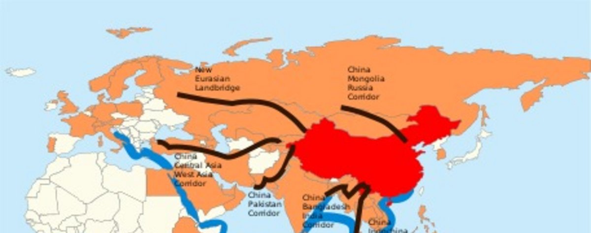 Map: China (red), AIIB members (orange), six land corridors (black), Maritime Silk Road (blue). Photo: Lommes via Wikipedia CC 4.0