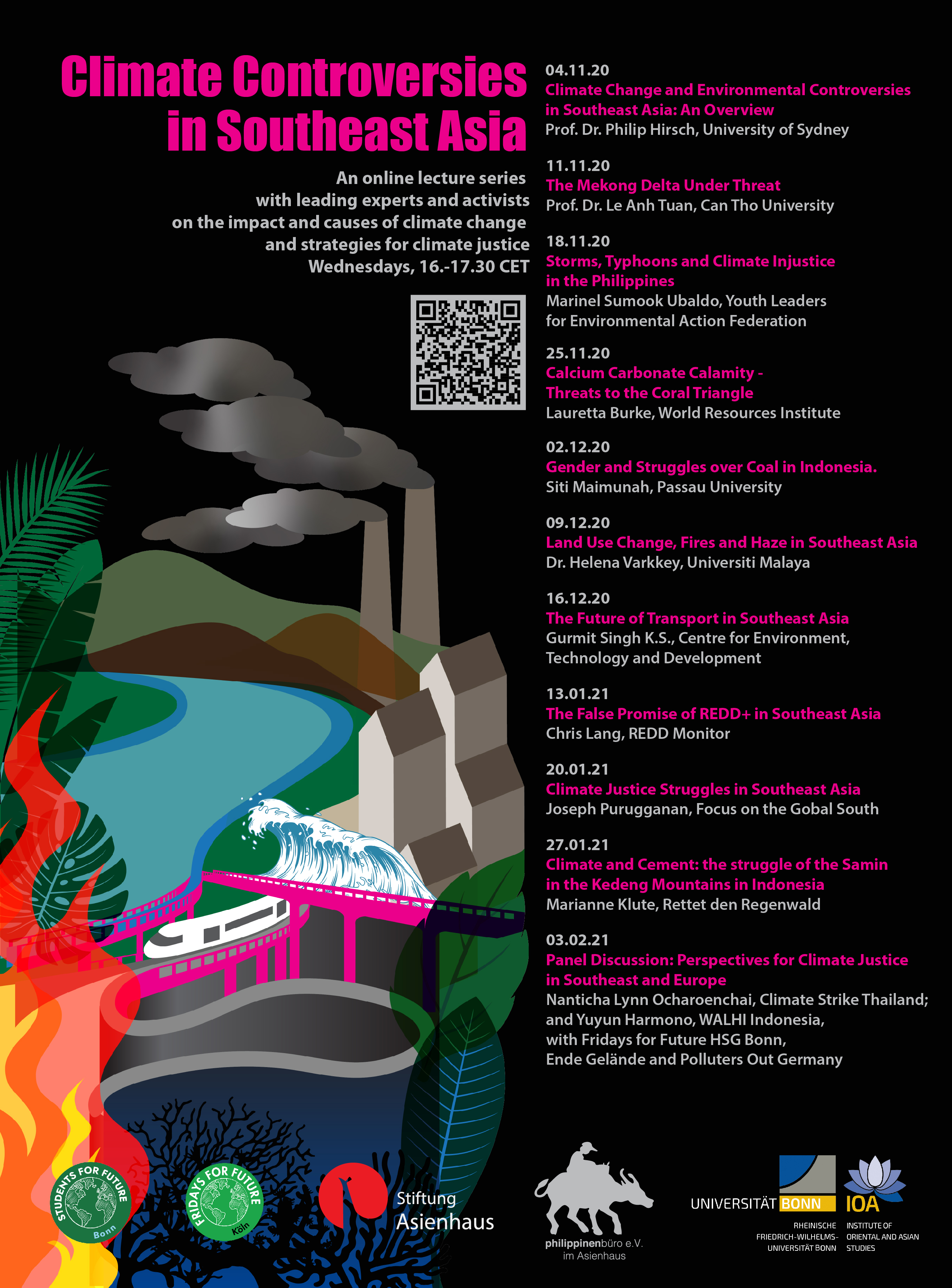 Die Reihe "Klimakontroversen" wird vom Seminar für Südostasienwissenschaften der Universität Bonn in Zusammenarbeit mit Fridays for Future (HSG Bonn), Fridays for Future (HSG Köln), der AG Ressourcen der Stiftung Asienhaus und dem philippinenbüro organisiert.