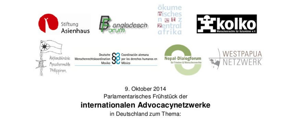 Fallbeispiele aus 9 Ländern (DR Kongo, China, Indonesien, Laos, Nepal, Philippinen, West Papua, Kolumbien, Mexiko) zeigen die prekäre Situation von Menschenrechtsverteidigern auf. Gleichzeitig enthält das Dossier konkrete Handlungshinweise für politische Verantwortliche, um die Arbeit von Menschenrechtsverteidigern zu unterstützen und Ihnen Schutz zu gewähren. Hierzu suchte das Internationale Advocacynetzwerk am 9. Oktober 2014 das Gespräch mit Parlamentariern.