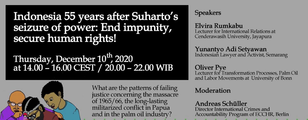 Looking at international and regional opportunities for justice, we invite you to discuss these questions with our international guests. The event will cover a range of topics, from the (lack of) coming to terms with the massacre of 1965/66 to labour and human rights in the palm oil production and the current human rights situation in Papua.