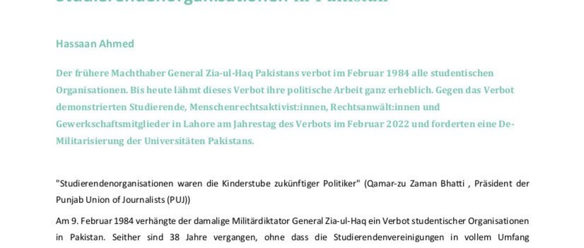 Der frühere Machthaber General Zia-ul-Haq Pakistans verbot im Februar 1984 alle studentischen Organisationen. Bis heute lähmt dieses Verbot ihre politische Arbeit ganz erheblich. Gegen das Verbot demonstrierten Studierende, Menschenrechtsaktivist:innen, Rechtsanwält:innen und Gewerkschaftsmitglieder in Lahore am Jahrestag des Verbots im Februar 2022 und forderten eine De-Militarisierung der Universitäten Pakistans. Hassaan Ahmed, Journalist der Zeitung Mirror, berichtet zum Jahrestag.