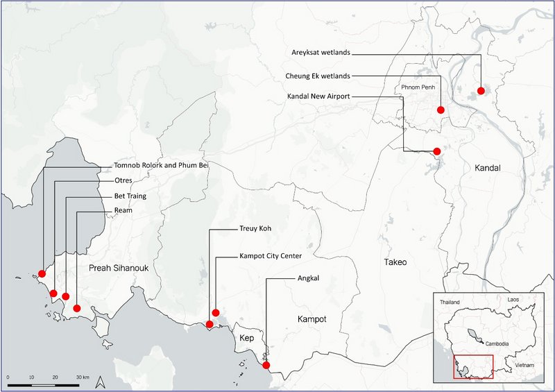 In Phnom Penh and Kandal Province, the development of the Cheung Ek wetlands and ING city is leading to community evictions and recurrent flooding, an outcome of the lakes being filled and the construction of flood mitigation canals. The building of the Kandal New Airport has led to violence, threats, and concerns over unfair compensation for the surrounding communities. Another area affected is the Areyksat wetlands, where riverside encroachment and the planned construction of a new bridge are causing distress among communities worried about potential eviction.