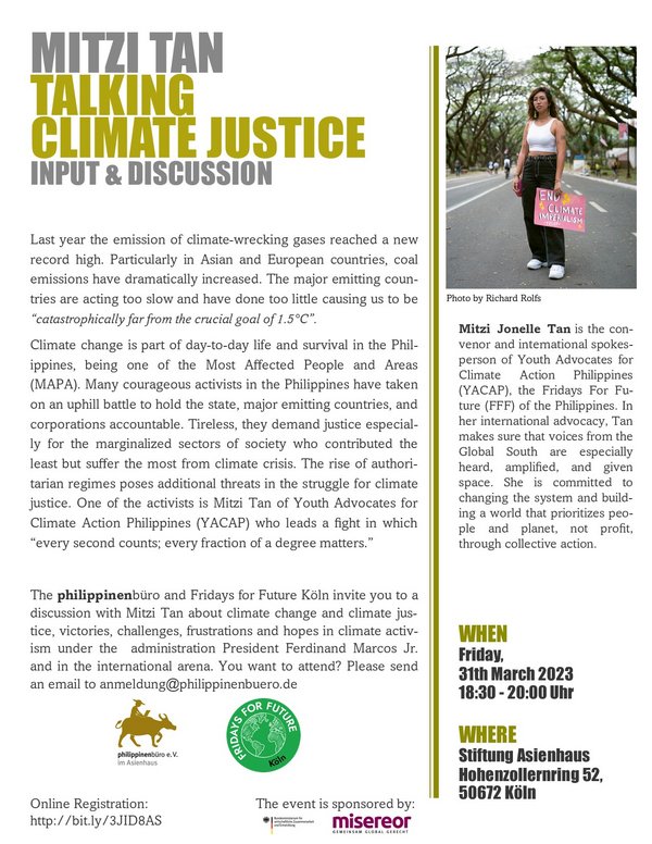 About 20 typhoons hit the Philippines every year. These and other extreme weather phenomenon intensify due to sustained global emission and bring havoc to people, nature, agriculture, economy, and infrastructure. Climate change is real and part of day-to-day life and survival in the Philippines, being one of the Most Affected People and Areas (MAPA). Many courageous activists in the Philippines have taken on an uphill battle to hold the state, major emitting countries, and corporations accountable. Tireless, they demand justice especially for the marginalized sectors of society who contributed the least but suffer the most from climate crisis. The rise of authoritarian regimes poses additional threats in the struggle for climate justice. One of the activists is Mitzi Jonelle Tan of Youth Advocates for Climate Action Philippines (YACAP). Her hopes lie with the people fighting for justice and concrete action to limit the rise of the global average temperature, a fight in which “every second counts; every fraction of a degree matters.”