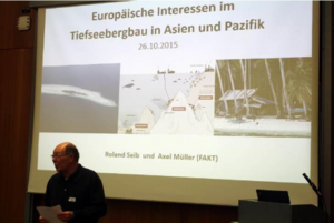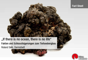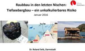 Noch selten auf der öffentlichen Agenda, sind seine Folgen für Umwelt und Anrainer dennoch schwerwiegend und irreversibel. Dennoch soll 2018 mit dem Abbau vor Papua-Neuguinea begonnen werden. In diesem Projekt arbeitet die Stiftung mit Dr. Roland Seib zusammen. Im Factsheet "If there is no ocean, there is no life" (2015) geht er vor allem auf gesetzliche Rahmenbedingungen, europäische Interessen und die möglichen Folgen ein. Aus diesem Factsheet entstanden sowohl eine Powerpointpräsentation auf Deutsch und Englisch, wie auch die Informationsseite "Tiefseebergbau: Fakten und Schlussfolgerungen" (2015).