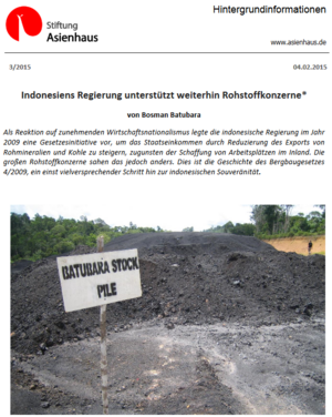 Darüber hinaus beschäftigt sich das Philippinenbüro mit Bergbau in den Philippinen und gab, in Kooperation mit der Südostasien Informationsstelle, Hintergrundpapiere zu China, Malaysia, Indonesien und den Philippinen heraus. Das China-Programm der Stiftung Asienhaus hat ebenfalls einen besonderen Fokus auf das Thema Rohstoffe.