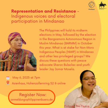 Im Mai finden auf den Philippinen die Zwischenwahlen statt, gefolgt von den Wahlen in der Autonomen Region Bangsamoro in Muslim Mindanao (BARMM) im Oktober 2025. Was steht für die indigene Nicht-Moro-Bevölkerung (NMIP) in Mindanao und andere weniger privilegierte Gruppen auf dem Spiel? Wir diskutieren diese Fragen mit der Friedensaktivistin Sharon Bulaclac und dem youth leader Jay Jomar Mosela.